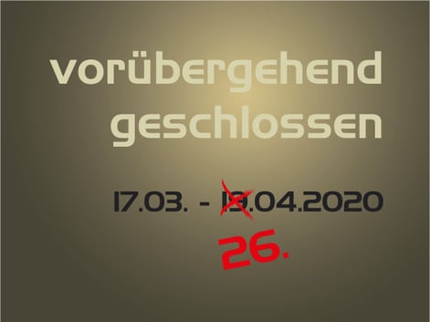 Der Bundesrat hat die verordneten Massnahmen bis am 26. April 2020 verlängert. Bis zu diesem Zeitpunkt sind wir per Gesetz gezwungen, unser Geschäft weiterhin geschlossen zu halten.